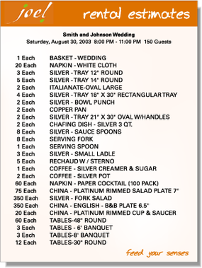 Jojies Catering Services Inc Offers Food Catering For Parties Since 1986. Celebrate Good Times Create Memories. Please send me a quotation for 100 pax complete set of catering equipment rentals only.